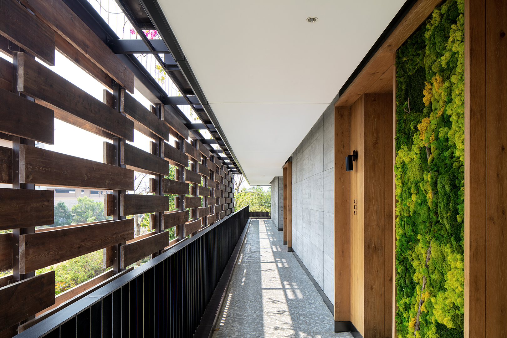 Here, that was applied to insulation, shading, ventilation, lighting and the use of natural materials. We used a ‘layering’ strategy, where screen-like materials create a ‘loose structure’ of layered spatial interfaces, forming walls that can be selectively penetrated by the wind, light, plants and views. Sun-shading metal mesh that reveals traces of time; ventilated wooden brick lattice screens; breathable stone gabion (a kind of metal basket or cage) walls filled with local volcanic lava stone; wooden lattice eaves; and permeable green walls. The layered design also addresses the different life cycles of materials and structures, easing maintenance and refurbishment. The materials for the layers come from sustainably managed forests and controlled sources.