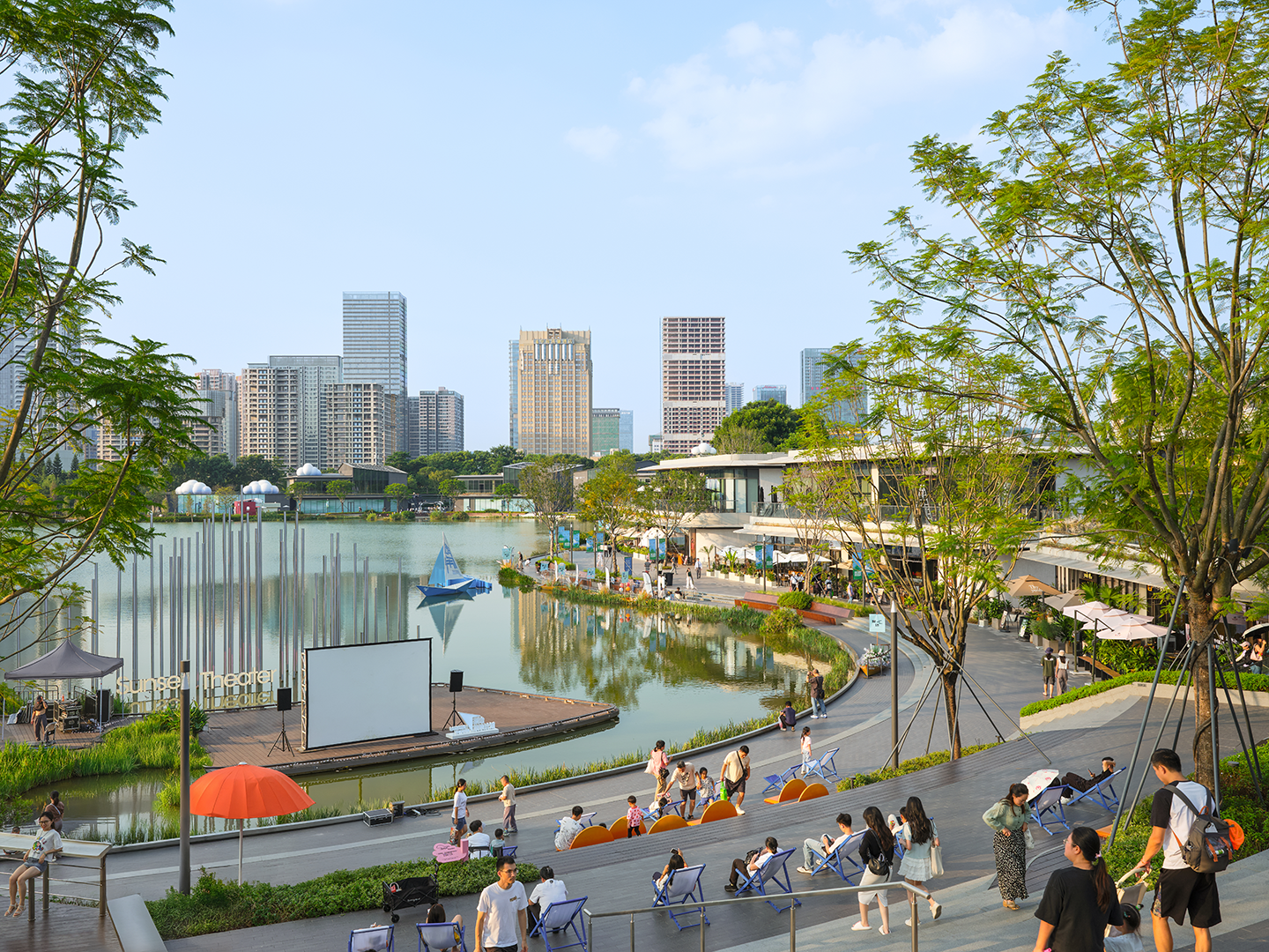 Via this model, the project leverages the post-pandemic awareness in health and well-being into a retail park centred on wellness, participatory art, community and green infrastructure. Multifunctional zones include shopping streets, fitness parks, town squares, a waterfront promenade and ecological areas with lake views.